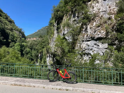 Die Anstiege sehr lang, bis zu 18km durchgehend, aber maximal „Tulbinger Niveau“ (ca. 6%),💪👍 die Abfahrten und welligen „Flachstücke“ verleiten zum „Fetzen“. Aber bitte mit Hirn, manchmal klassische Serpentinen, wo es dir in der Kurve bei 4G die Augen rausdrückt, dann wieder scharfkantige Steine von den beeindruckenden Felswänden. In den kleinen unbesiegbaren Dörfern unglaublich schlechte Straßen mit Schlaglöchern, kaum sichtbare Bumps.😱 Öfters im Nirgendwo auf ca. 800 Meter Seehöhe Mandeln/innen mit Neopren. Ausnahmsweise keine Triathleten, sondern Abenteurer, die sich fürs Canyoning vorbereiten. Wo da Bäche sein sollen, ist mir oft ein Rätsel🤔