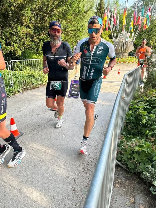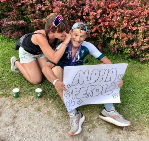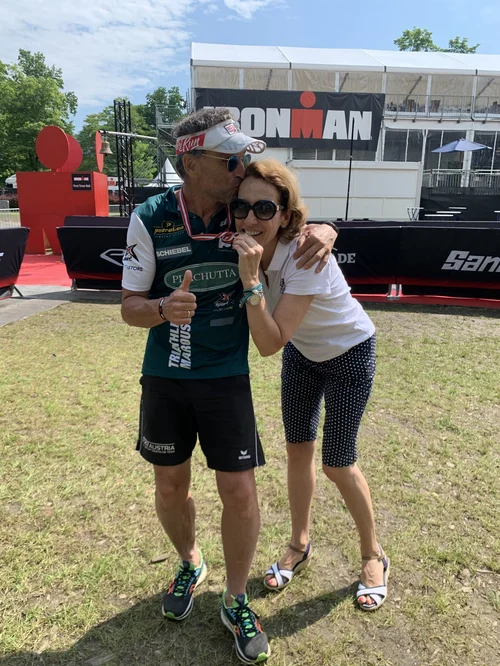 Inzwischen, ca. bei km 27, führe ich das Rennen an.😱💪 Meine Supporter Tri Biene Melly Melanie Marouschek, ihr Schatzi Franz Franz Eichinger(mein perfekter Trainer), meine beste Ehefrau von allen Martina😍🥰 und so viele die mich kennen, sind aus dem Häusl. Ab km 33 ist es verdammt knapp und unglaublich spannend zwischen vier Athleten. Schnell noch ein Möööök Telefonat und dann beginnt eine meiner härtesten Rennphasen ever. Stehen bleiben geht net, Sieg oder Niederlage sind soooo knapp beieinander. Speiben geht auch nicht mehr, obwohl mir die Magenwand am Gaumen kitzelt. Also renn ich einfach. Ich weiß nicht wie, ich bin in Trance, ab und zu stecke ich meine dampfende Birne in den Wasserbottich. Laufen, laufen ich höre nur „bitte bleib nicht stehen renn, renn“ Und ich tue es. „Never give up“ - mental und motorisch stark wie nie, bleibe ich zwischen den Laben kein einziges Mal stehen und ich finishe, ich weiß echt nicht wie, den Marathon in halbwegs soliden 04:23:33. 💪👍💪