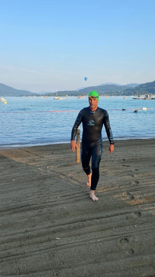 Das Schwimmen echt cool, ich komme sofort in den Rhythmus, vergoggle mich aber um satte 200 Meter, weil ich zweimal nach steuerboard abdrifte😒 – Oidaaaa trotzdem 01:07:27 genau im Plan👍 Beim Wechsel zum Rad lässt mich mein Polar Tacho im Stich – ab Meter 1 keine Verbindung zu den Wattpedalen, daher keine Wattmessung 😡 Ich daher mit meinem Tyrranosaurus Rex Zugang rein nach Gefühl. Gott sei Dank habe ich die Split Zeiten von früher im Kopf und ich weiß ich bin gut, ja sehr gut unterwegs💪👍