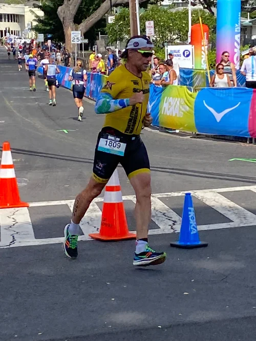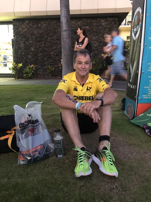 Das Radfahren verbocke ich aus zwei Gründen und das ging so: Fülle nie einen Sirup in die Aufleger Flasche und versuche ihn mit dem Trinkhalm zu „zutzeln“ Geht net, viel zu dick. Dir treten beim krampfhaften Ansaugen die Augen aus den Höhlen, die Wangen sind kleiner als deine Nase breit ist, die Trommelfälle kommen aufgeblasen aus den Ohren und deine Gaumenkugel ist dort wo einmal die Mandeln waren Oidaaaa. Gott sei Dank habe ich einen Vollvisierhelm auf. Als ich dann noch auf den ersten 7k die Gel Notflasche wegen der rumpeligen Straße verliere, habe ich 173k ein Versorgungsproblem zu lösen. Gott sei Dank schneidet mir bei einer Labe ein US Cowboy mit einem Leatherman den Strohhalm mit den Worten „You are so awesome“ auf und ich komme halbwegs zum dicken Saft. Dass wegen des verbogenen Schaltauges ich nicht am vorderen Kettenblatt den 19 Meilen Anstieg nach Hawi - mit ständigem starkem Gegenwind von rechts vorne - fahren kann, ist die zweite Geschichte. Sicherheitshalber dreht der Wind die letzten 34 Meilennach Kona wieder und kommt dankbarer Weise wieder von rechts vorne – wieder Oidaaaaa. Nach richtig zachen, ungemein körperlich und mental fordernden 180k steige ich nach 06:03:02 vom Rad, ohne irgendeine Idee wie ich jetzt noch die 42km Marathon laufen soll.