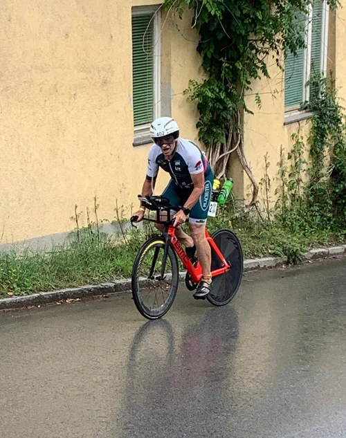 Für meine Verhältnisse „wutzle“ ich mich (Achtung Sickerwitz🤣) blitzartig aus dem Neo, um sofort am Rad zu einem Torpedo zu mutieren. Bis zur Abfahrt S33 fahre ich über 41km/h Schnitt, trete die 14 Minuten auf den „Gansbacher“ mit 275NP und dann wirkt Einstein: Ich lege mich flach auf den Aufleger, stürze mich wie ein Königsadler getreu meinem Motto „scheiß dich nicht an“ mit bis zu 76km/h in die Tiefe. Statt der Fahrradglocke schreie ich nur „keep right, keep right“. Ich fliege in die Kurven rein und nicht raus🤣🚀 Wie geil ist das, wenn 85kg die Schwerkraft nutzen, getreu der Formel E=m*c²*85kg oder so ähnlich🤣😂 Mit der „Stangelpuch“ wäre das nie gegangen muahahaha. Nach sensationellen 02:37:26 und 232 NP-Schnitt hüpfe ich fast wie ein Federchen hochmotiviert vom Rad, die Beine sind nicht paniert. Ich weiß, das Rennen kann jetzt noch gaaaaanz geil werden 💪👍